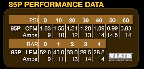 Style:Air CompressorThe Viair 85P is a small 12-volt portable air compressor with a built-in LED work light. It is capable of inflating up to 31-inch tires by simply plugging into your cigarette lighter power port (14.5 amperes maximum), starting your engine, and connecting the screw-on tire chuck to a tire valve stem before turning the unit on. Tire pressure can be monitored using the gauge incorporated into the top of the unit. The power cord is 10 feet long and the maximum working pressure is 60 PSI. Performance Specifications: Tire Fill rate: 0-30 PSI (195/70R14) - 2 minutes, 0 seconds, Tire Fill rate: 0-30 PSI (19570R14) - 1 minute, 0 seconds, Tire Fill rate: 0-30 PSI (225/60R18) - 2 minutes, 50 seconds, Tire Fill rate: 0-30 PSI (225/60R18) - 1 minute, 30 seconds, Tire Fill rate: 0-30 PSI (31 x 10.5 inch) - 4 minutes, 30 seconds, Tire Fill rate: 0-30 PSI (31 x 10.5 inch) - 2 minutes, 15 seconds.